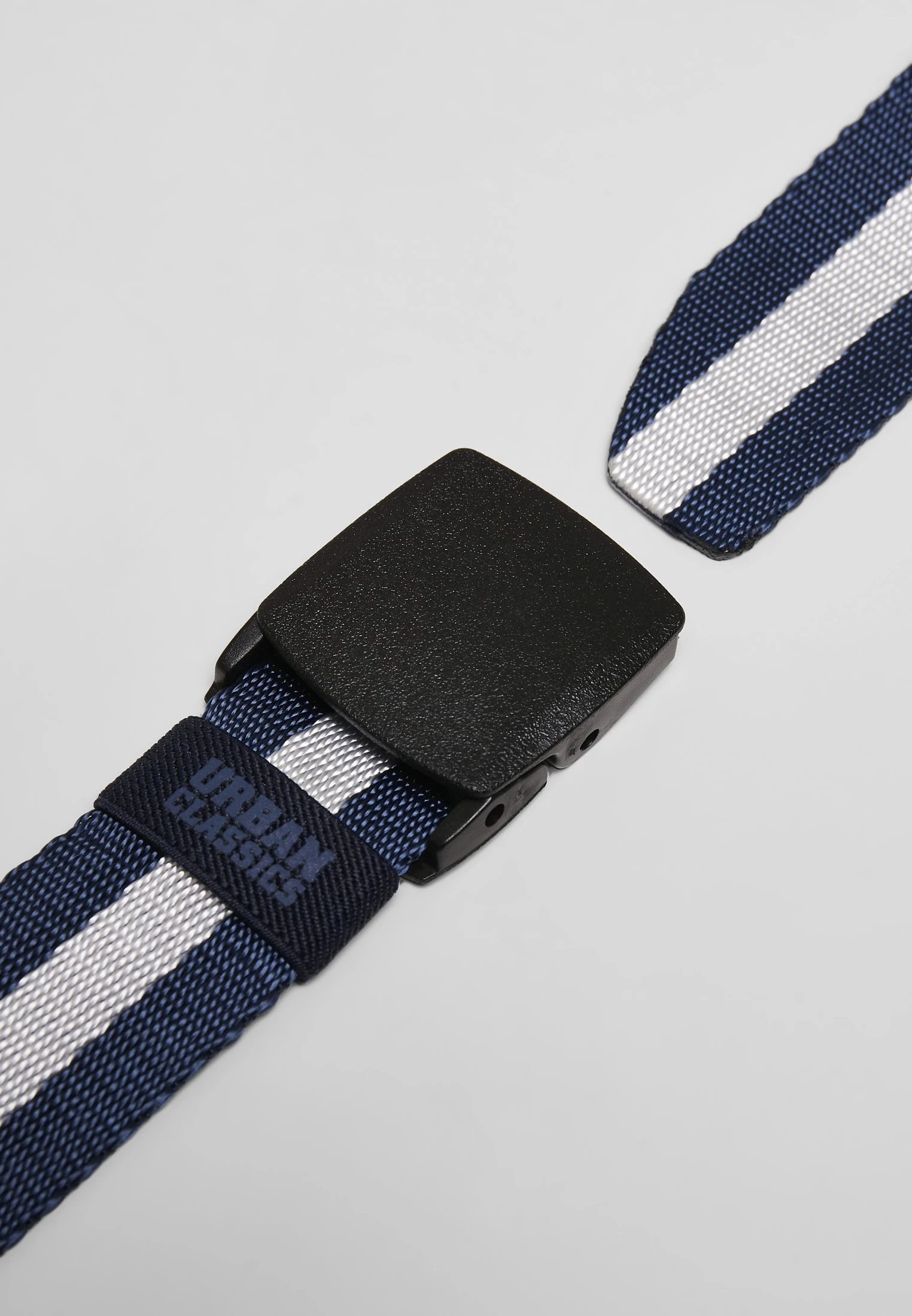 Der schlichte Gürtel kommt mit einem breiten, weißen Längsstreifen in der Mitte. Er besteht aus leicht schimmerndem, robustem wie strapazierfähigem Polyester und wird in den zwei Größen S/M 110cm und L/XL 130cm geliefert. Geschlossen und geöffnet wird er mittels einer stabilen, verdeckten Schnalle.