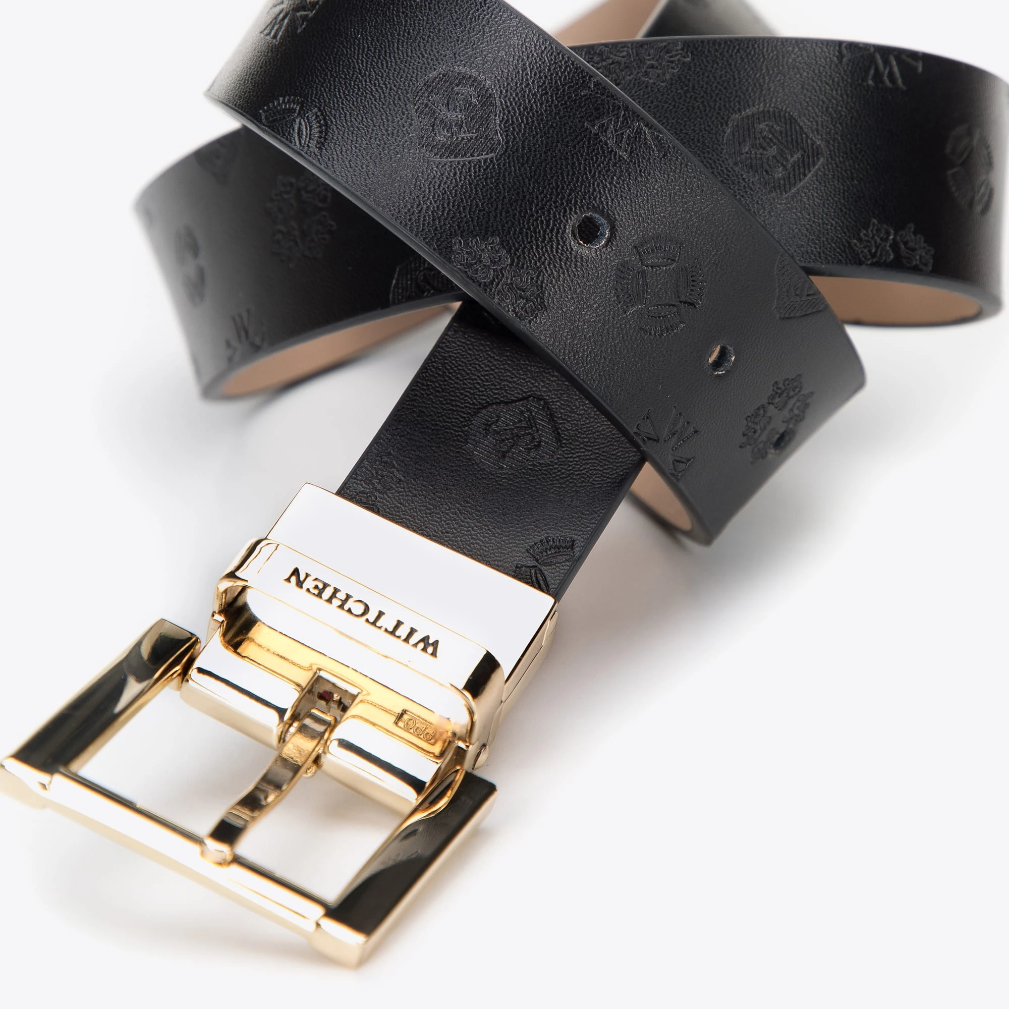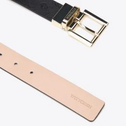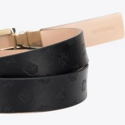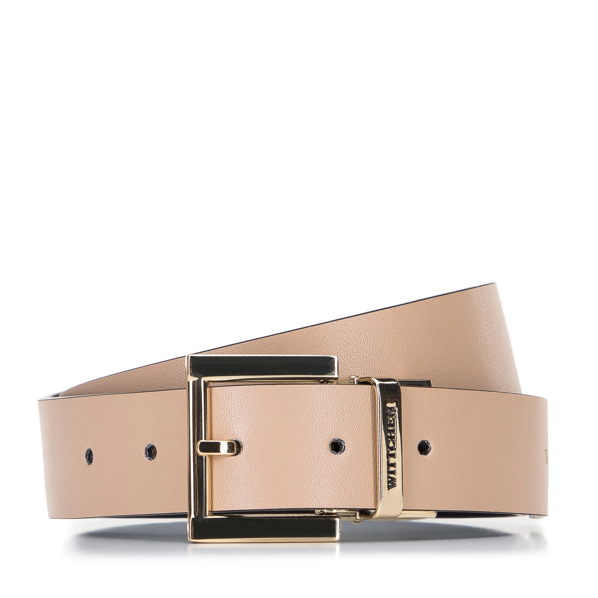 This beautiful, feminine belt will team nicely with many outfits: both elegant and casual. Crafted in leather with the embossed texture on one side and a smooth matte contrast reverse. With high shine gold-tone rectangular buckle with the WITTCHEN logo, this accessory will add a glistening finish to your looks. In order to change the side of the belt, pull the buckle slightly and turn it over.