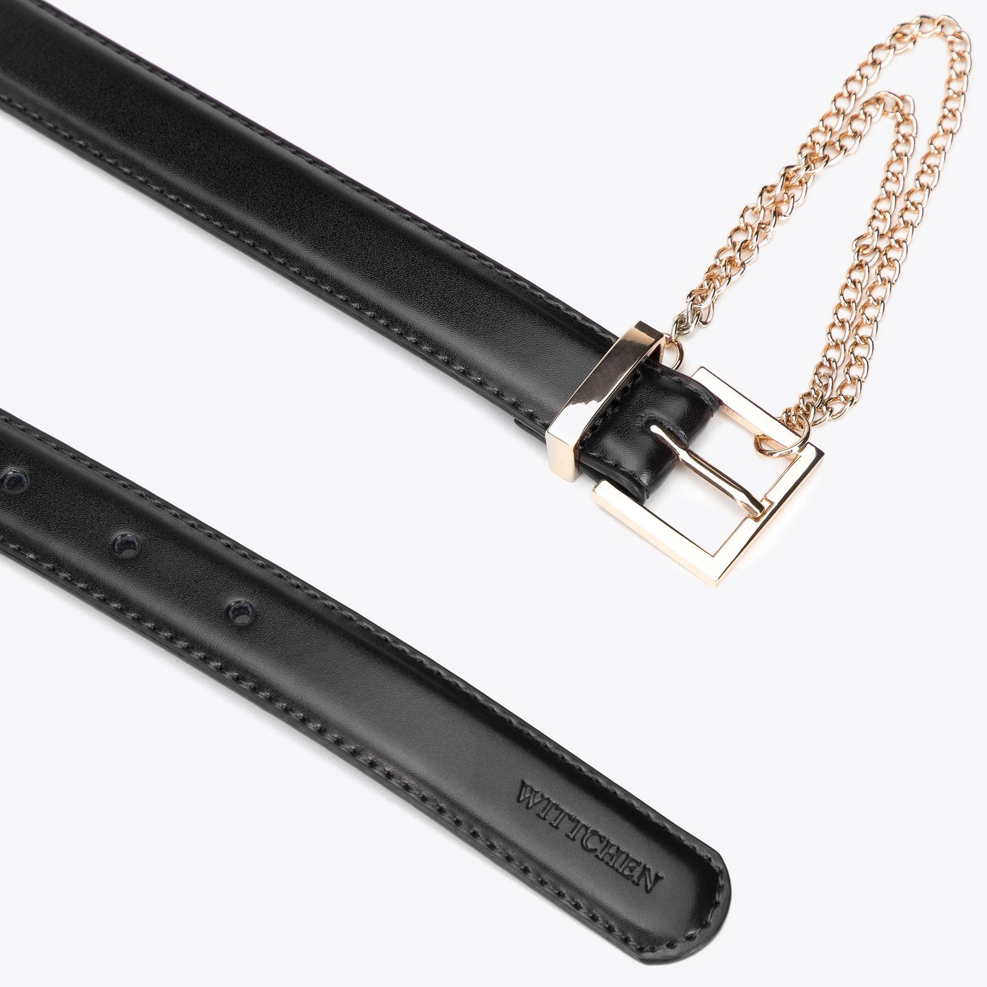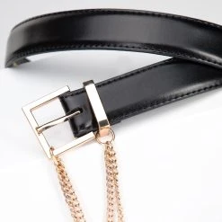 Dieser stylische Gürtel ist ein Klassiker mit einem modernen Twist. Es ist aus hochwertigem Naturleder mit abgesteppten Kanten gefertigt. Es ist mit einer dünnen Kette verziert, die gefaltet und mit einer kleinen quadratischen Schnalle befestigt werden kann. Sie können es mit Ihrer Lieblingshose oder mit einem übergroßen Hemd tragen, um die Taille zu betonen. Ein dünner Damen-Ledergürtel mit Kette verleiht jedem Ihrer Outfits einen Charakter.